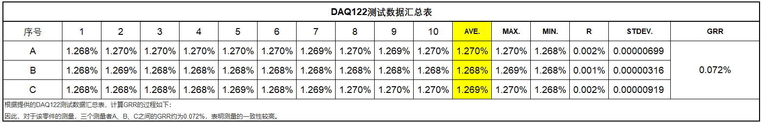 Щоб переконатися, що вибрана карта збору даних відповідає вимогам, команда ME протестувала її. Аналіз показує, що вибрана карта збору даних має чудову стабільність із GRR приблизно 0,072% серед трьох вимірювачів A, B та C.