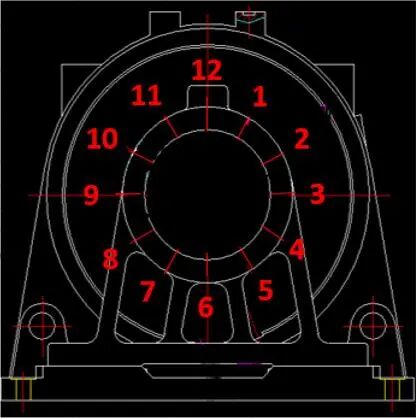 • a) Проблема: Співвісність тонко обробленого внутрішнього отвору гнізда підшипника вузла основи машини з подвійною опорою є нестабільною. Після складання це призведе до того, що биття підшипникової камери всієї основи машини перевищить допуск, що не відповідає вимогам креслення.
