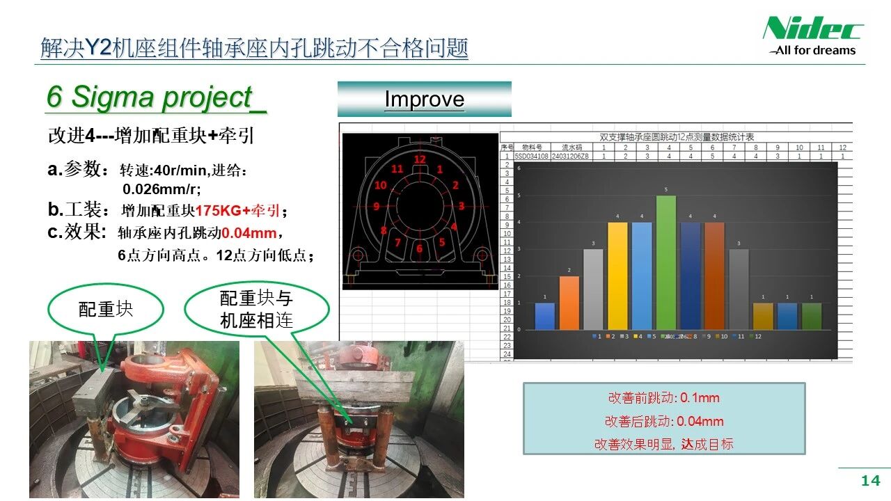 За результатами аналізу та перевірки команда пропонує та реалізує цільові рішення. Це може включати оптимізацію процесу, модернізацію технології, покращення роботи та інші аспекти. Важливо, щоб команда перевірила ефективність рішень, щоб переконатися, що вони можуть отримати очікувані результати в реальній роботі. Після успішної верифікації команда оновить опис процесу та методи роботи, щоб переконатися, що нові рішення можна стандартизувати, а результати покращення можна просувати протягом усього процесу обробки. Наприклад, вирішуючи проблему биття основного вузла машини серії Y2, наша команда запропонувала цільові рішення на основі результатів, проаналізованих на етапі аналізу. Ці рішення включають додавання опорних точок у підвішеному положенні гнізда підшипника, додавання сталевих пластин біля ніжок основи машини для підвищення жорсткості та додавання противаг навпроти ніжок основи машини. Потім одна за одною проводилися перевірки пробної обробки, щоб підтвердити, що дані перевірки обробки відповідають очікуваним цілям команди, і, нарешті, було знайдено ефективне рішення.