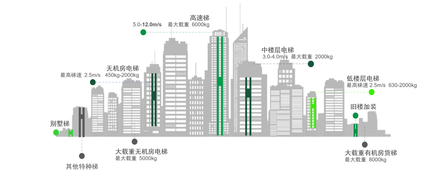 Ми пропонуємо широкий асортимент тягових машин і відповідних мейнфреймів, придатних для сценаріїв застосування з максимальною вантажопідйомністю 6000 кг (співвідношення 2:1) і максимальною швидкістю 12 м/с (співвідношення 1:1). Замовники можуть безпосередньо вибирати відповідні моделі на основі параметрів ліфта, що значно скорочує цикл проектування.