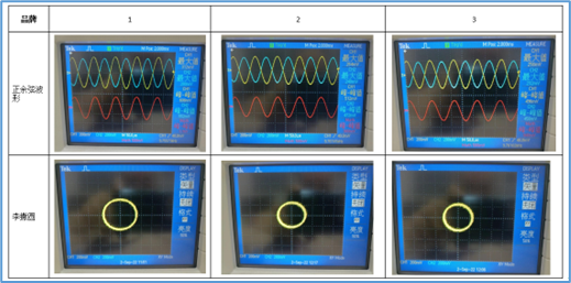 За тих самих умов перевіряються амплітуда сигналу, значення розмаху сигналу та площа фігури Ліссажу кодерів різних брендів, щоб кількісно порівняти ефективність захисту від перешкод і роздільну здатність сигналу кодерів.